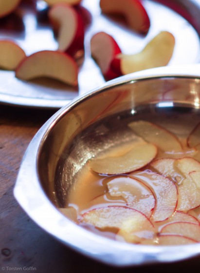 Die Äpfel sorgfältig waschen, vierteln, entkernen – aber nicht schälen! Mit einem Gemüsehobel oder ähnlichem in ca. 1 mm starke Spalten schneiden und in einer Mischung aus Apfelsaft und Zitronensaft zwischenlagern. Die Menge des Zitronensafts ist abhängig von der Säure der Äpfel. Für säuerliche Äpfel reicht ein kleiner Spritzer, für sehr süsse Äpfel darf es deutlich mehr sein.