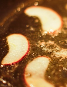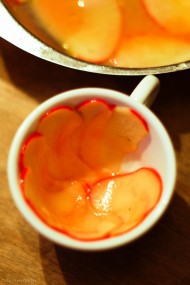 Zucker in wenig Butter bei schwacher Hitze karamelisieren, danach mit drei bis vier Esslöffeln Apfelsaft und Zitrone nach Bedarf (s.o.) ablöschen. Im entstandenen Sirup die Apfelspalten kurz von einer Seite anziehen lassen (30 – 60 Sekunden), herausnehmen und in kaltem Apfelsaft abschrecken, um eventuelle nachgaren zu verhindern. Die Spalten sollten danach weich genug sein, um sich problemlos in die Tassenrundung zu fügen, aber noch genug Struktur und etwas „Restbiß“ haben, damit man sie problemlos verarbeiten kann.